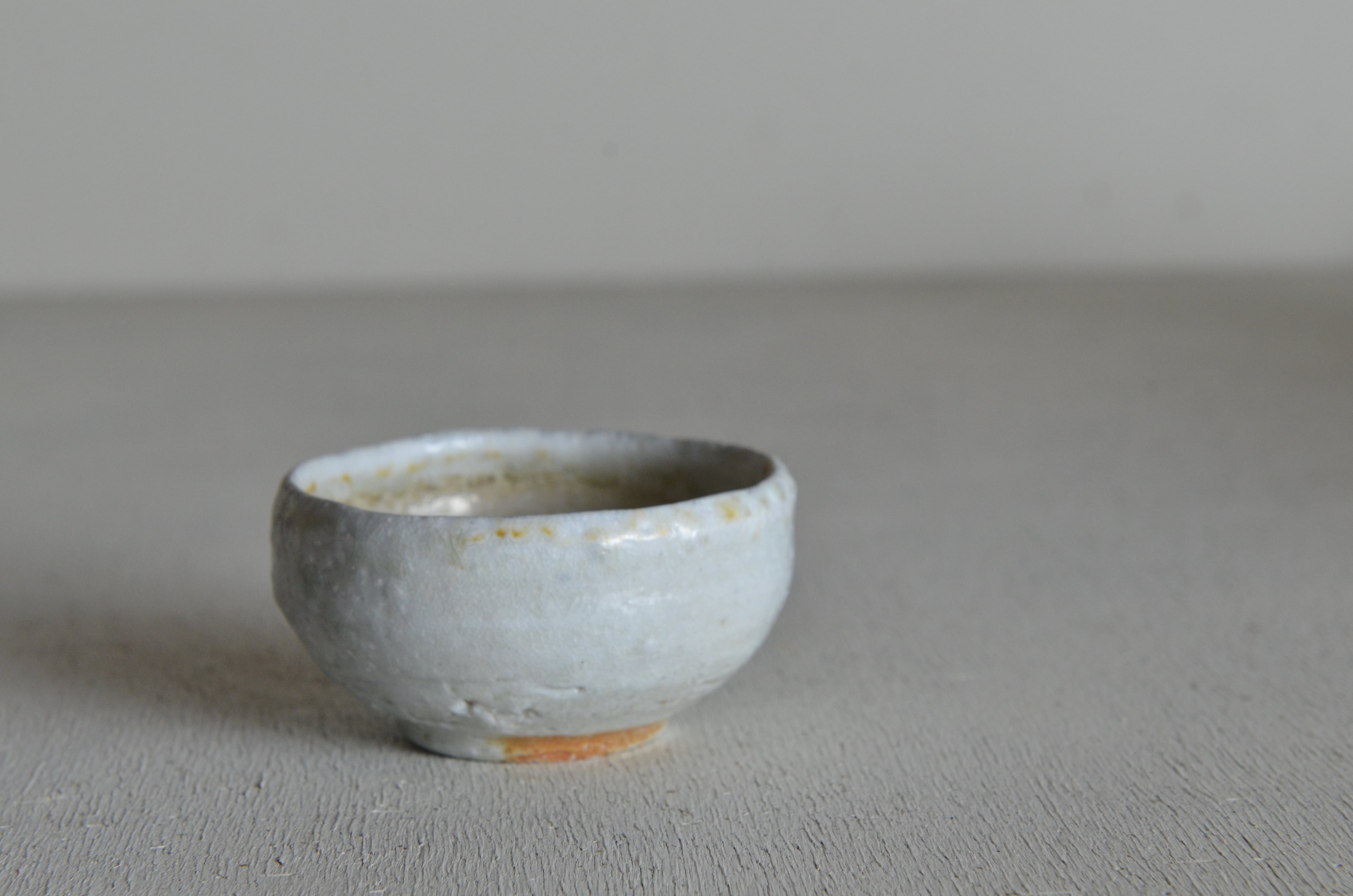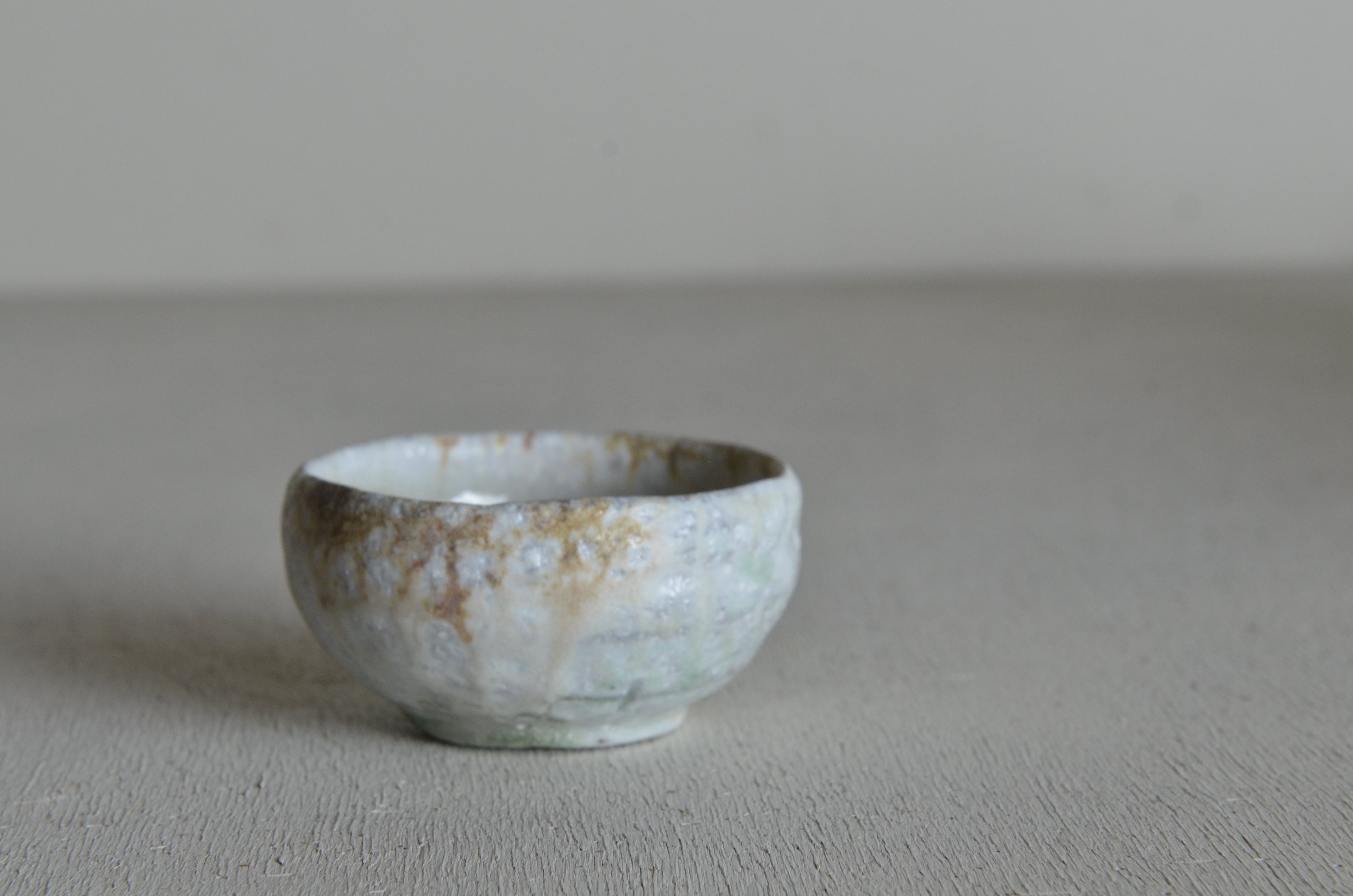 白土に自然釉で薄茶、ベージュ、緑、灰色といった色が重なり合い、底にできた釉だまりによるエメラルド色のガラス質、美しい器が焼けました。